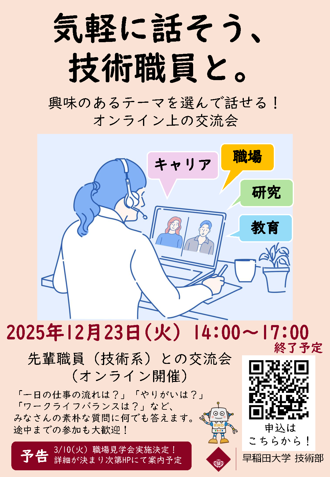 早稲田大学技術職員に興味がある方向けに、実際に西早稲田キャンパスで働く先輩技術職員との交流会を開催します。